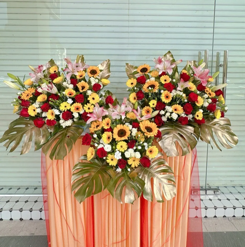 SUNFLOWER, RED ROSES , GEBERAS, LILLY, MONSTERA LEAF, and RAIN FOREST for your grand opening.